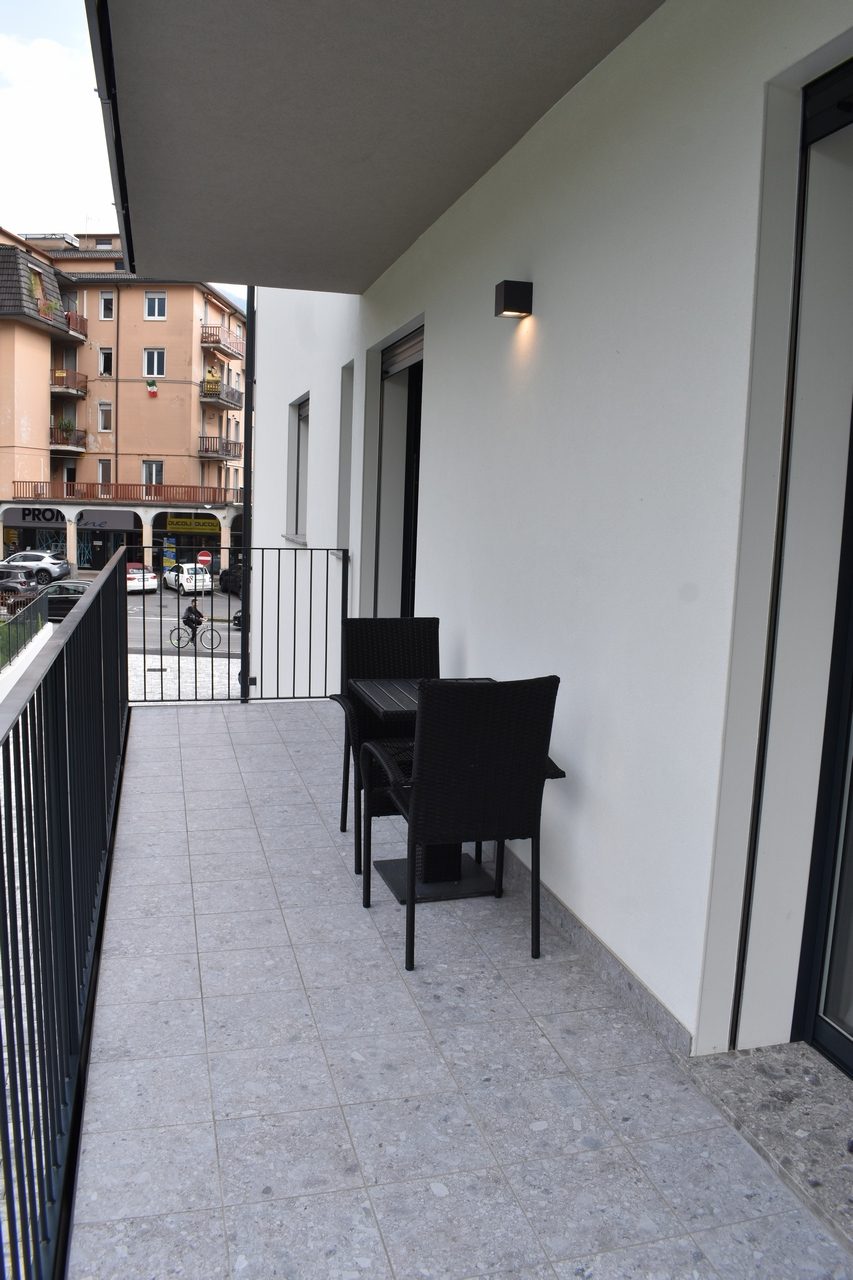 Appartamento climatizzato con soggiorno dotato di divano letto e TV a schermo piatto, una camera da letto separata con letto matrimoniale e un bagno con doccia e bidet. La cucina include piano cottura, frigorifero, forno a microonde e utensili da cucina. Il balcone offre una splendida vista sulla città.