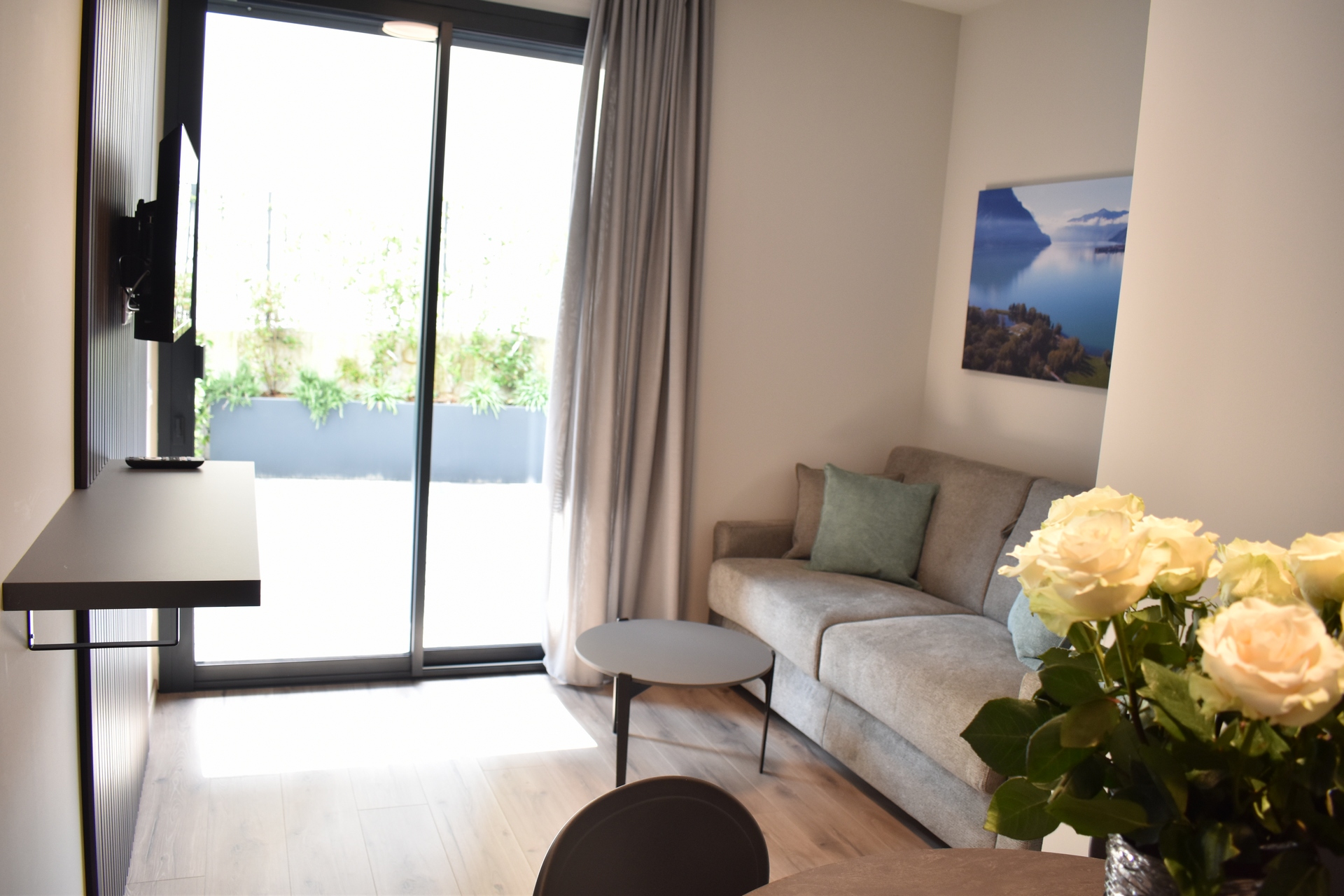 Appartamento climatizzato composto da soggiorno con divano letto e TV a schermo piatto, una camera da letto separata con letto matrimoniale e un bagno con doccia e bidet. La cucina è attrezzata con piano cottura, frigorifero, forno a microonde e utensili da cucina. All’esterno, un giardino privato con vista sulla città.